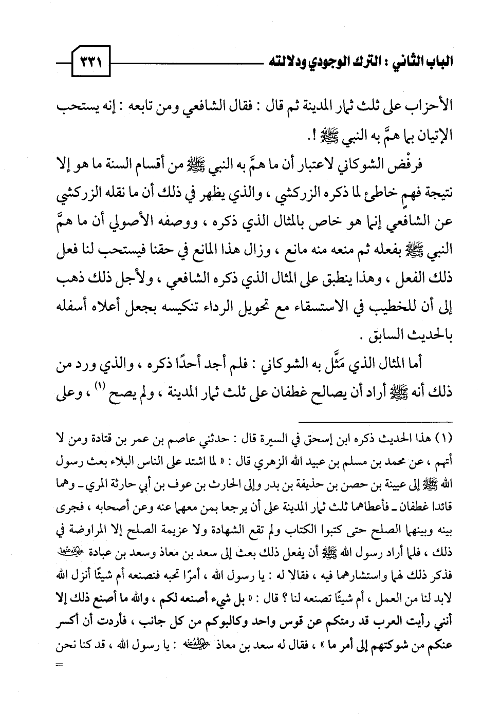 أما المثال الذي مَثَّل به الشوكاني: فلم أجد أحدًا ذكره، والذي ورد من ذلك أنه - صلى الله عليه وسلم - أراد أن يصالح غطفان على ثلث ثمار المدينة، ولم يصح (١)، وعلى