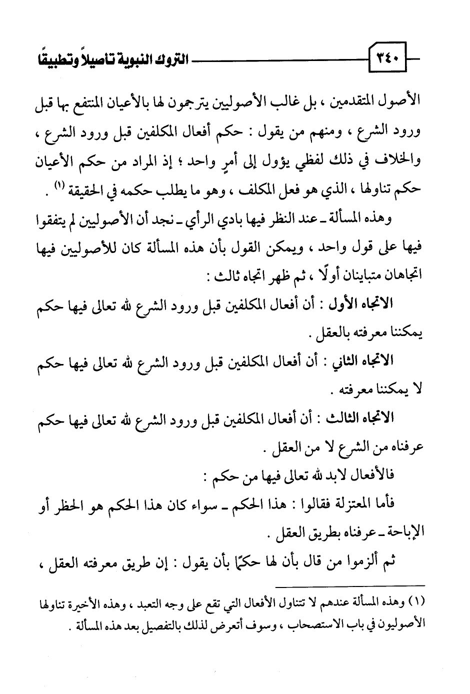 (١) وهذه المسألة عندهم لا تتناول الأفعال التي تقع على وجه التعبد، وهذه الأخيرة تناولها الأصوليون في باب الاستصحاب، وسوف أتعرض لذلك بالتفصيل بعد هذه المسألة.