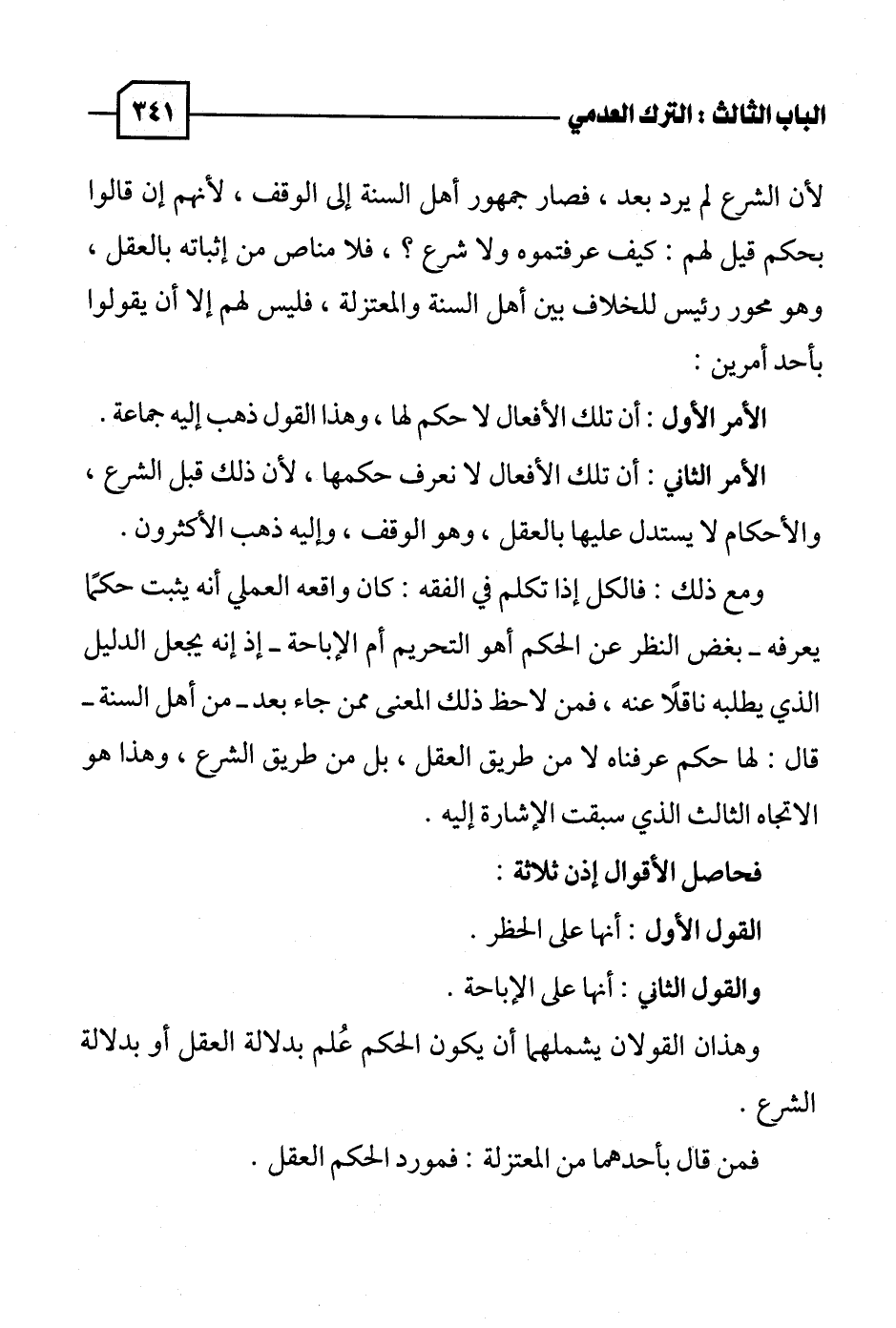 ومع ذلك: فالكل إذا تكلم في الفقه: كان واقعه العملي أنه يثبت حكمًا يعرفه - بغض النظر عن الحكيم أهو التحريم أم الإباحة - إذ إنه يجعل الدليل الذي يطلبه ناقلًا عنه، فمن لاحظ ذلك المعنى ممن جاء بعد - من أهل السنة - قال: لها حكم عرفناه لا من طريق العقل، بل من طريق الشرع، وهذا هو الاتجاه الثالث الذي سبقت الإشارة إليه.