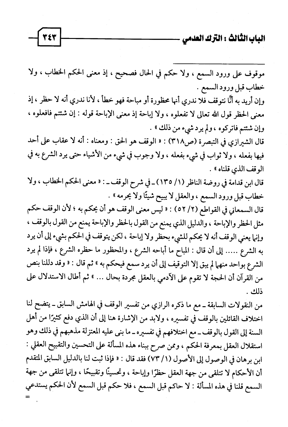 قال السمعاني في القواطع (٢/ ٥٢): "ليس معنى الوقف هو أن يحكم به؛ لأن الوقف حكم مثل الحظر والإباحة، والدليل الذي يمنع من القول بالحظر والإباحة يمنع من القول بالوقف، وإنما يعني الوقف أنه لا يحكم للشيء بحظر ولا إباحة، لكن يتوقف في الحكم بشيء إلى أن يرد به الشرع. . . . . إلى أن قال: المباح ما أباحه الشرع، والمحظور ما حظره الشرع، فإذا لم يرد الشرع بواحد منهما لم يبق إلا التوقيف إلى أن يرد سمع فيحكم به" ثم قال: "وقد دللنا بنص من القرآن أن الحجة لا تقوم على الآدمي بالعقل مجردة بحال. . . " ثم أطال الاستدلال على ذلك.