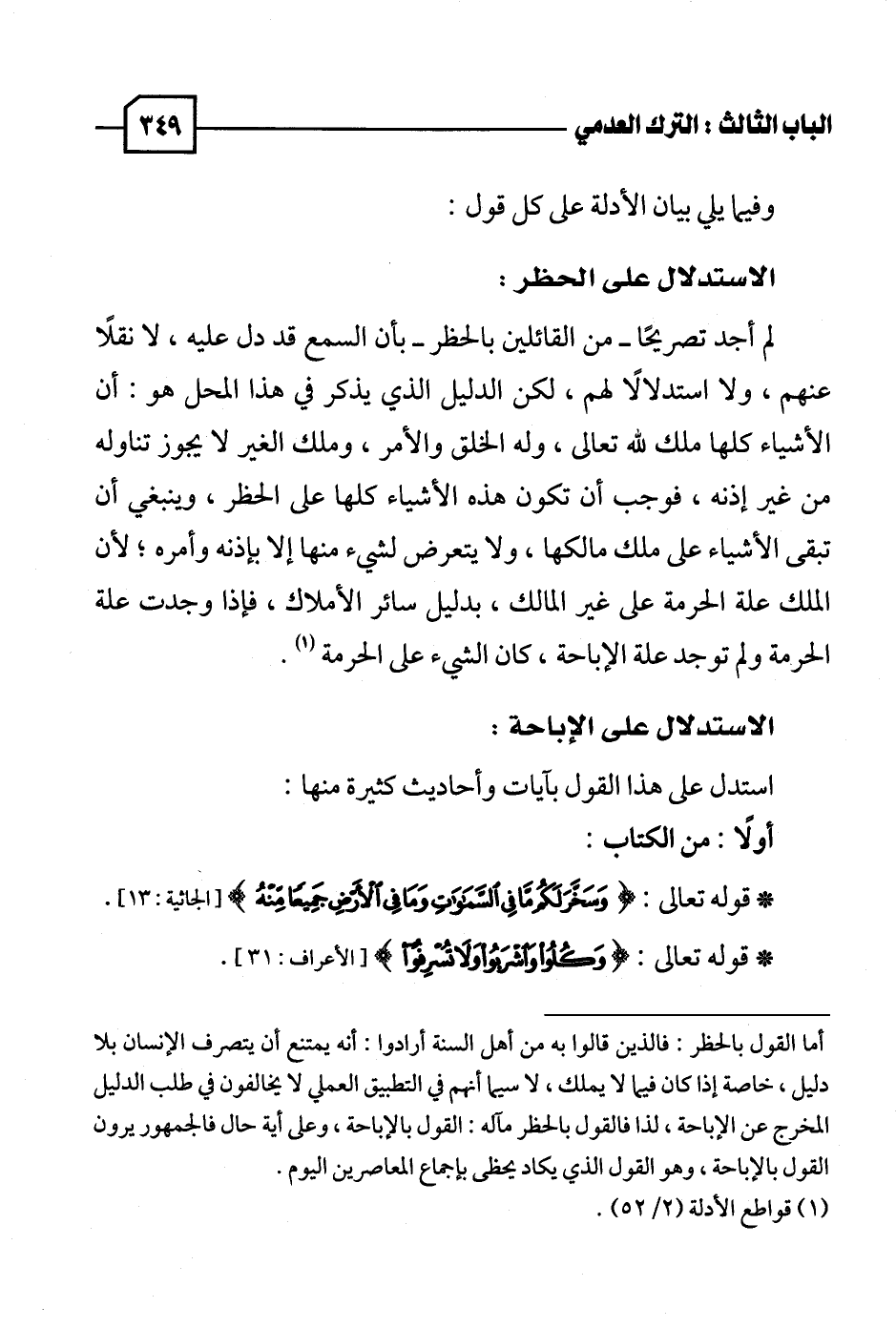 = أما القول بالحظر: فالذين قالوا به من أهل السنة أرادوا: أنه يمتنع أن يتصرف الإنسان بلا دليل، خاصة إذا كان فيما لا يملك، لا سيما أنهم في التطبيق العملي لا يخالفون في طلب الدليل المخرج عن الإباحة، لذا فالقول بالحظر مآله: القول بالإباحة، وعلى أية حال فالجمهور يرون القول بالإباحة، وهو القول الذي يكاد يحظى بإجماع المعاصرين اليوم.