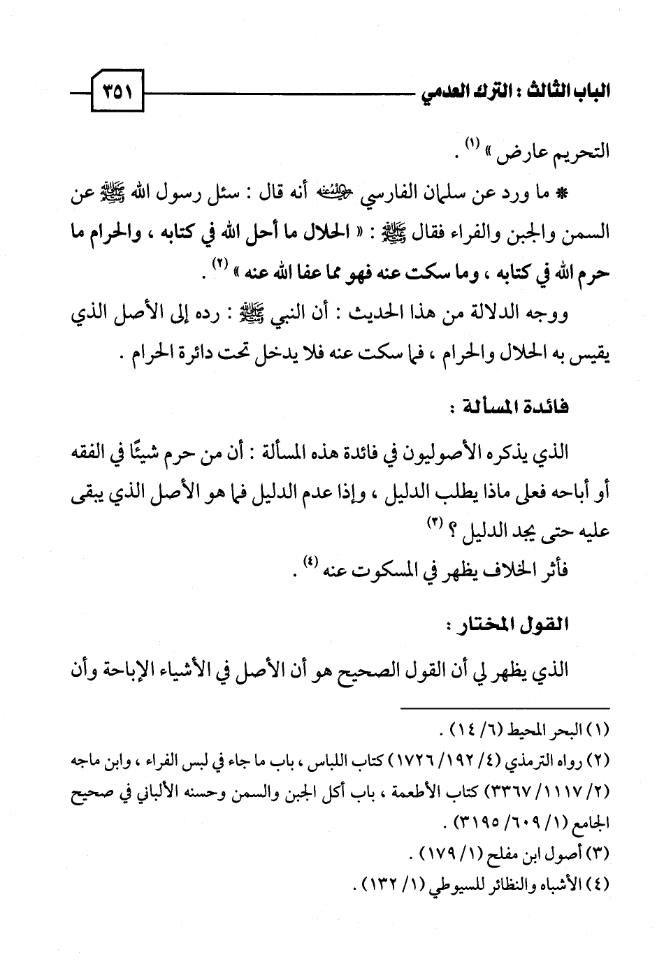 * ما ورد عن سلمان الفارسي - رضي الله عنه - أنه قال: سئل رسول الله - صلى الله عليه وسلم - عن السمن والجبن والفراء فقال - صلى الله عليه وسلم -: "الحلال ما أحل الله في كتابه، والحرام ما حرم الله في كتابه، وما سكت عنه فهو مما عفا الله عنه" (٢).