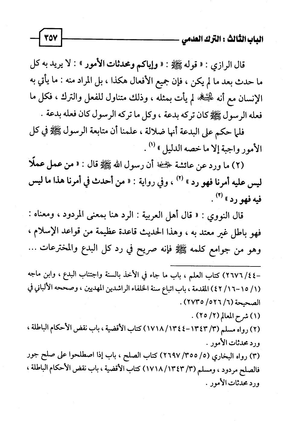 قال الرازي: "قوله - صلى الله عليه وسلم -: "وإياكم ومحدثات الأمور": لا يريد به كل ما حدث بعد ما لم يكن، فإن جميع الأفعال هكذا، بل المراد منه: ما يأتي به الإنسان مع أنه عليه السلام لم يأت بمثله، وذلك متناول للفعل والترك، فكل ما فعله الرسول - صلى الله عليه وسلم - كان تركه بدعة، وكل ما تركه الرسول كان فعله بدعة.