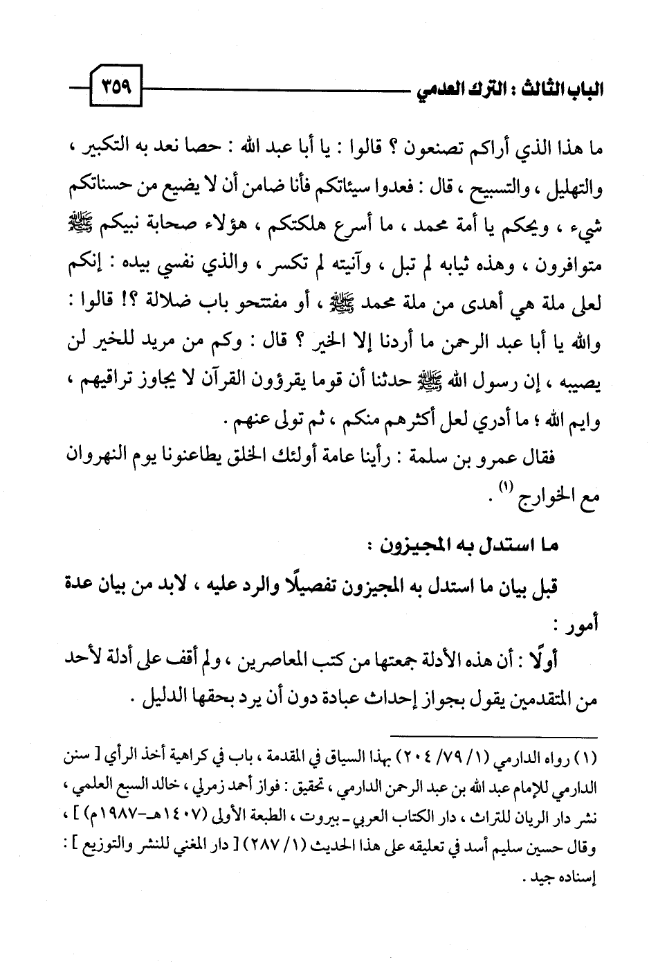 (١) رواه الدارمي (١/ ٧٩ / ٢٠٤) بهذا السياق في المقدمة، باب في كراهية أخذ الرأي [سنن الدارمي للإمام عبد الله بن عبد الرحمن الدارمي، تحقيق: فواز أحمد زمرلي، خالد السبع العلمي، نشر دار الريان للتراث، دار الكتاب العربي - بيروت، الطبعة الأولى (١٤٠٧ هـ - ١٩٨٧ م)]، وقال حسين سليم أسد في تعليقه على هذا الحديث (١/ ٢٨٧) [دار المغني للنشر والتوزيع]: إسناده جيد.