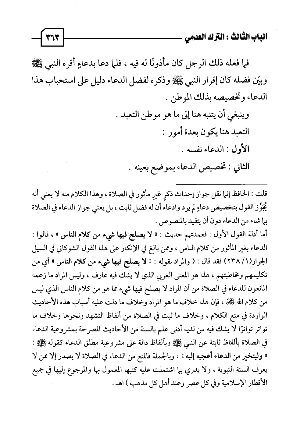 = قلت: الحافظ إنما نقل جواز إحداث ذكرٍ غيرِ مأثور في الصلاة، وهذا الكلام منه لا يعني أنه يُجوِّز القول بتخصيص دعاءٍ لم يرد وادعاء أن له فضل ثابت، بل يعني جواز الدعاء في الصلاة بما شاء من الدعاء دون أن يتقيد بالمنصوص.