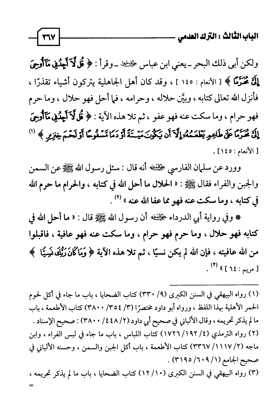 وورد عن سلمان الفارسي - رضي الله عنه - أنه قال: سئل رسول الله - صلى الله عليه وسلم - عن السمن والجبن والفراء فقال - صلى الله عليه وسلم -: "الحلال ما أحل الله في كتابه، والحرام ما حرم الله في كتابه، وما سكت عنه فهو مما عفا الله عنه" (٢).