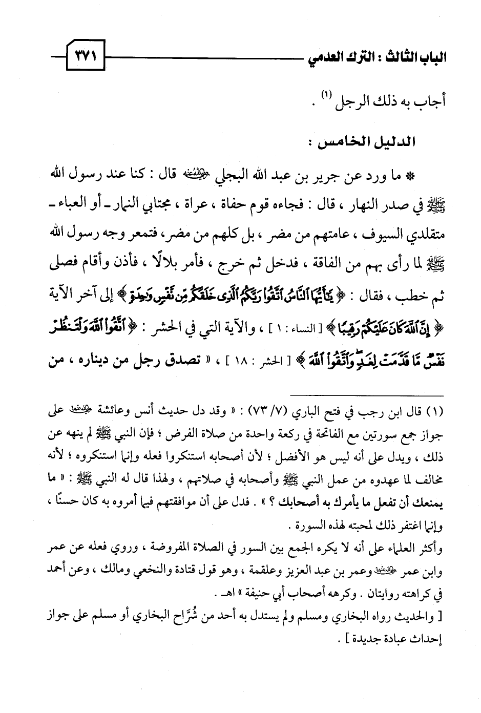 * ما ورد عن جرير بن عبد الله البجلي - رضي الله عنه - قال: كنا عند رسول الله - صلى الله عليه وسلم - في صدر النهار، قال: فجاءه قوم حفاة، عراة، مجتابي النمار - أو العباء - متقلدي السيوف، عامتهم من مضر، بل كلهم من مضر، فتمعر وجه رسول الله - صلى الله عليه وسلم - لما رأى بهم من الفاقة، فدخل ثم خرج، فأمر بلالًا، فأذن وأقام فصلى ثم خطب، فقال: {يَاأَيُّهَا النَّاسُ اتَّقُوا رَبَّكُمُ الَّذِي خَلَقَكُمْ مِنْ نَفْسٍ وَاحِدَةٍ} إلى آخر الآية {إِنَّ اللَّهَ كَانَ عَلَيْكُمْ رَقِيبًا} [النساء: ١]، والآية التي في الحشر: {اتَّقُوا اللَّهَ وَلْتَنْظُرْ نَفْسٌ مَا قَدَّمَتْ لِغَدٍ وَاتَّقُوا اللَّهَ} [الحشر: ١٨]، "تصدق رجل من ديناره، من