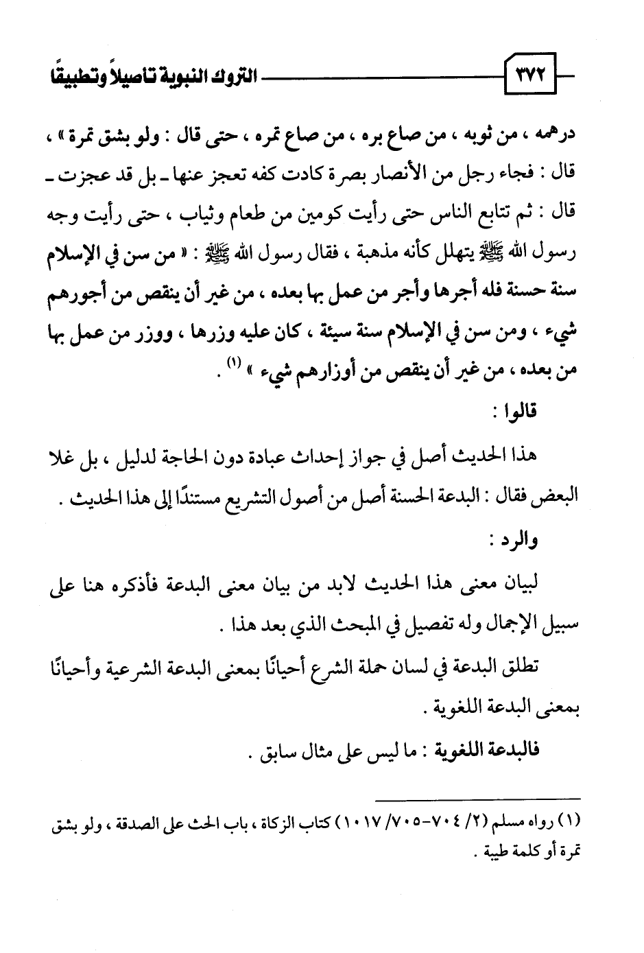 درهمه، من ثوبه، من صاع بره، من صاع تمره، حتى قال: ولو بشق تمرة"، قال: فجاء رجل من الأنصار بصرة كادت كفه تعجز عنها - بل قد عجزت - قال: ثم تتابع الناس حتى رأيت كومين من طعام وثياب، حتى رأيت وجه رسول الله - صلى الله عليه وسلم - يتهلل كأنه مذهبة، فقال رسول الله - صلى الله عليه وسلم -: "من سن في الإسلام سنة حسنة فله أجرها وأجر من عمل بها بعده، من غير أن ينقص من أجورهم شيء، ومن سن في الإسلام سنة سيئة، كان عليه وزرها، ووزر من عمل بها من بعده، من غير أن ينقص من أوزارهم شيء" (١).