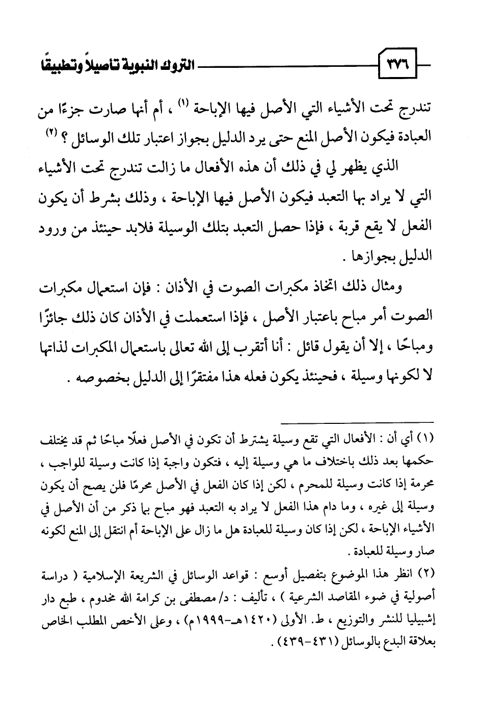 ومثال ذلك اتخاذ مكبرات الصوت في الأذان: فإن استعمال مكبرات الصوت أمر مباح باعتبار الأصل، فإذا استعملت في الأذان كان ذلك جائزًا ومباحًا، إلا أن يقول قائل: أنا أتقرب إلى الله تعالى باستعمال المكبرات لذاتها لا لكونها وسيلة، فحينئذ يكون فعله هذا مفتقرًا إلى الدليل بخصوصه.