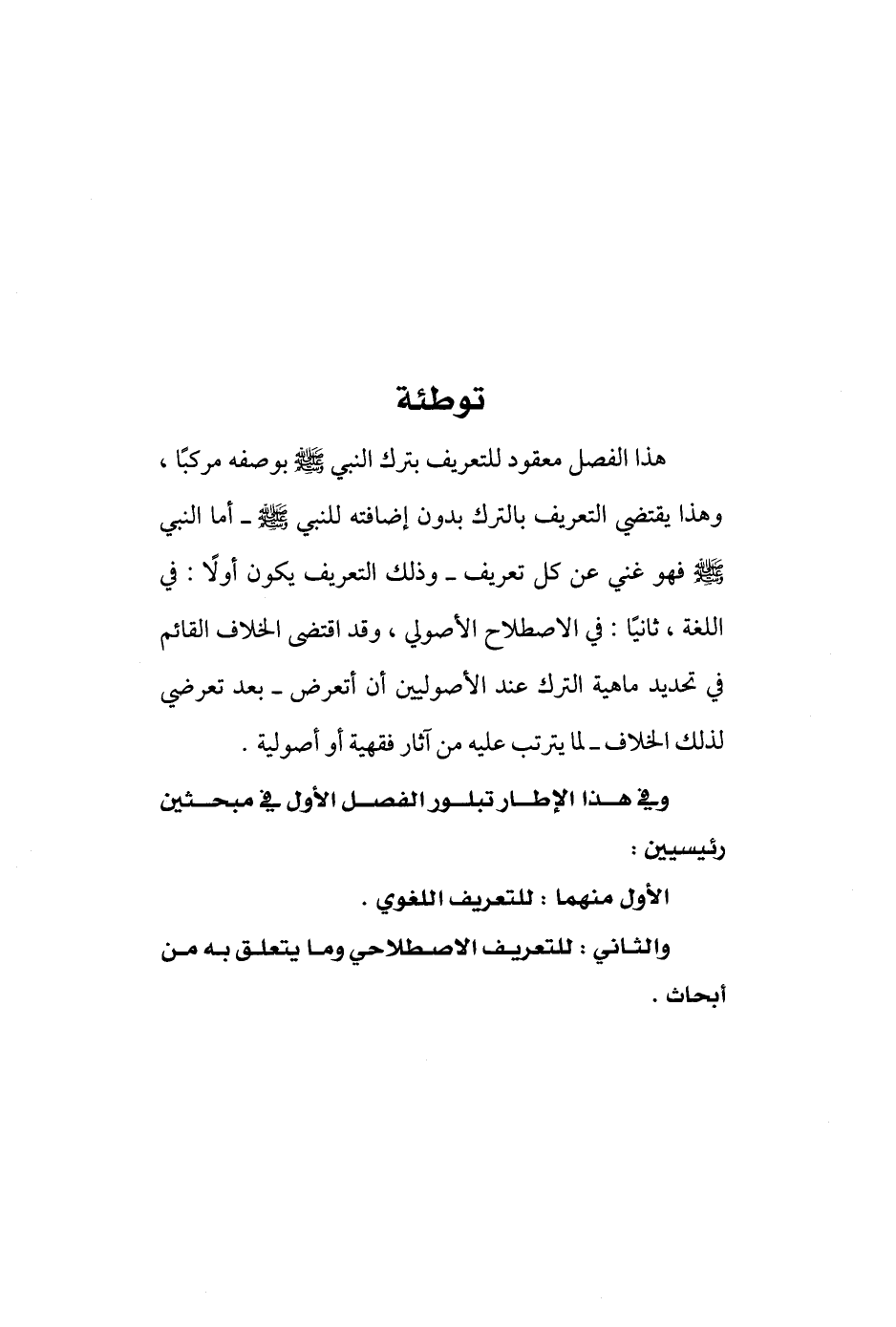هذا الفصل معقود للتعريف بترك النبي - صلى الله عليه وسلم - بوصفه مركبًا، وهذا يقتضي التعريف بالترك بدون إضافته للنبي - صلى الله عليه وسلم - أما النبي - صلى الله عليه وسلم - فهو غني عن كل تعريف - وذلك التعريف يكون أولًا: في اللغة، ثانيًا: في الاصطلاح الأصولي، وقد اقتضى الخلاف القائم في تحديد ماهية الترك عند الأصوليين أن أتعرض - بعد تعرضي لذلك الخلاف - لما يترتب عليه من آثار فقهية أو أصولية.