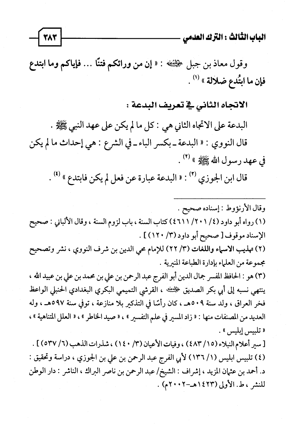 (٤) تلبيس إبليس (١/ ١٣٦) لأبي الفرج عبد الرحمن بن علي بن الجوزي، دراسة وتحقيق: د. أحمد بن عثمان المزيد، إشراف: الشيخ/ عبد الرحمن بن ناصر البراك، الناشر: دار الوطن للنشر، ط. الأولى (١٤٢٣ هـ - ٢٠٠٢ م).