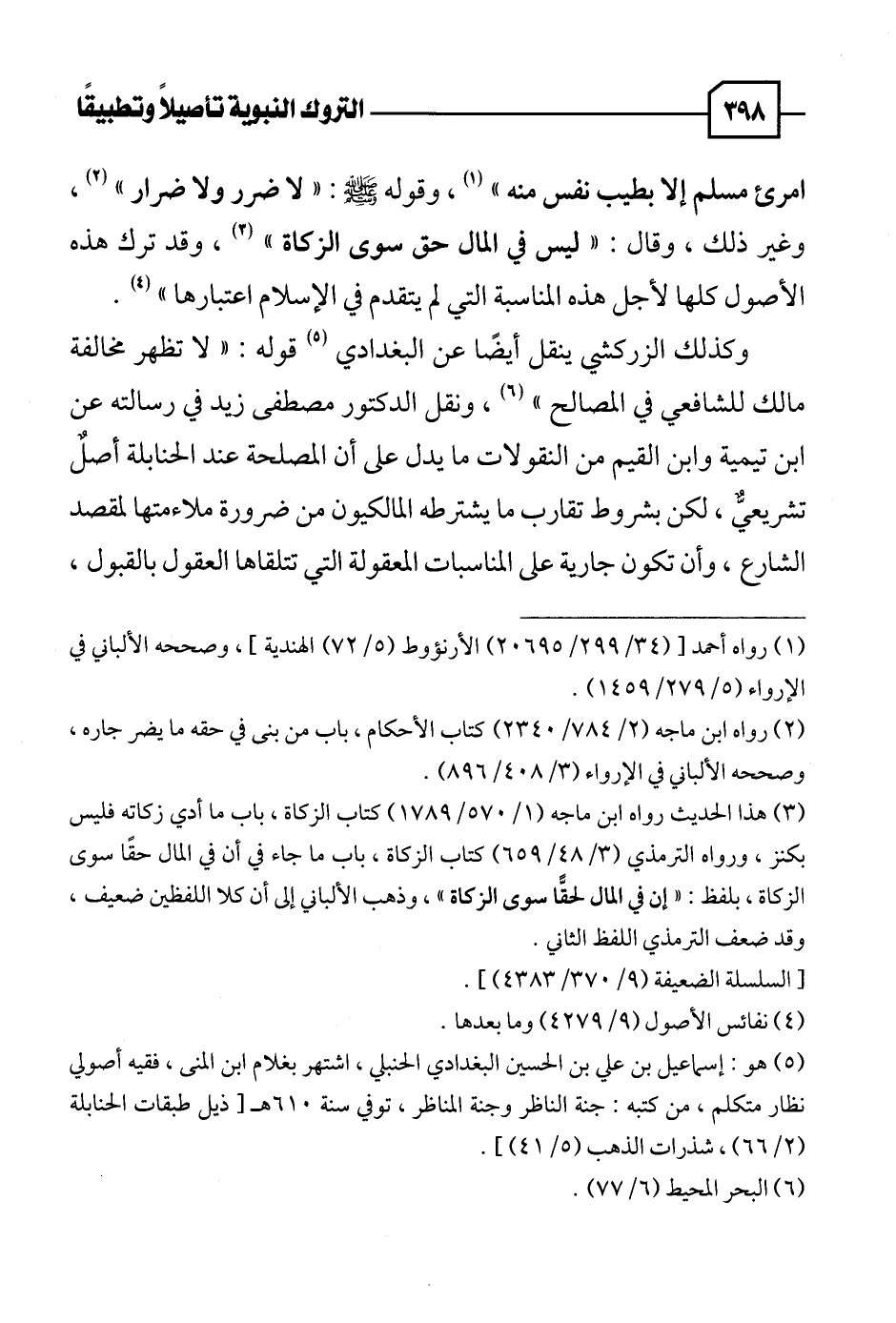 وكذلك الزركشي ينقل أيضًا عن البغدادي (٥) قوله: "لا تظهر مخالفة مالك للشافعي في المصالح" (٦)، ونقل الدكتور مصطفى زيد في رسالته عن ابن تيمية وابن القيم من النقولات ما يدل على أن المصلحة عند الحنابلة أصل تشريعيّ، لكن بشروط تقارب ما يشترطه المالكيون من ضرورة ملاءمتها لمقصد الشارع، وأن تكون جارية على المناسبات المعقولة التي تتلقاها العقول بالقبول،