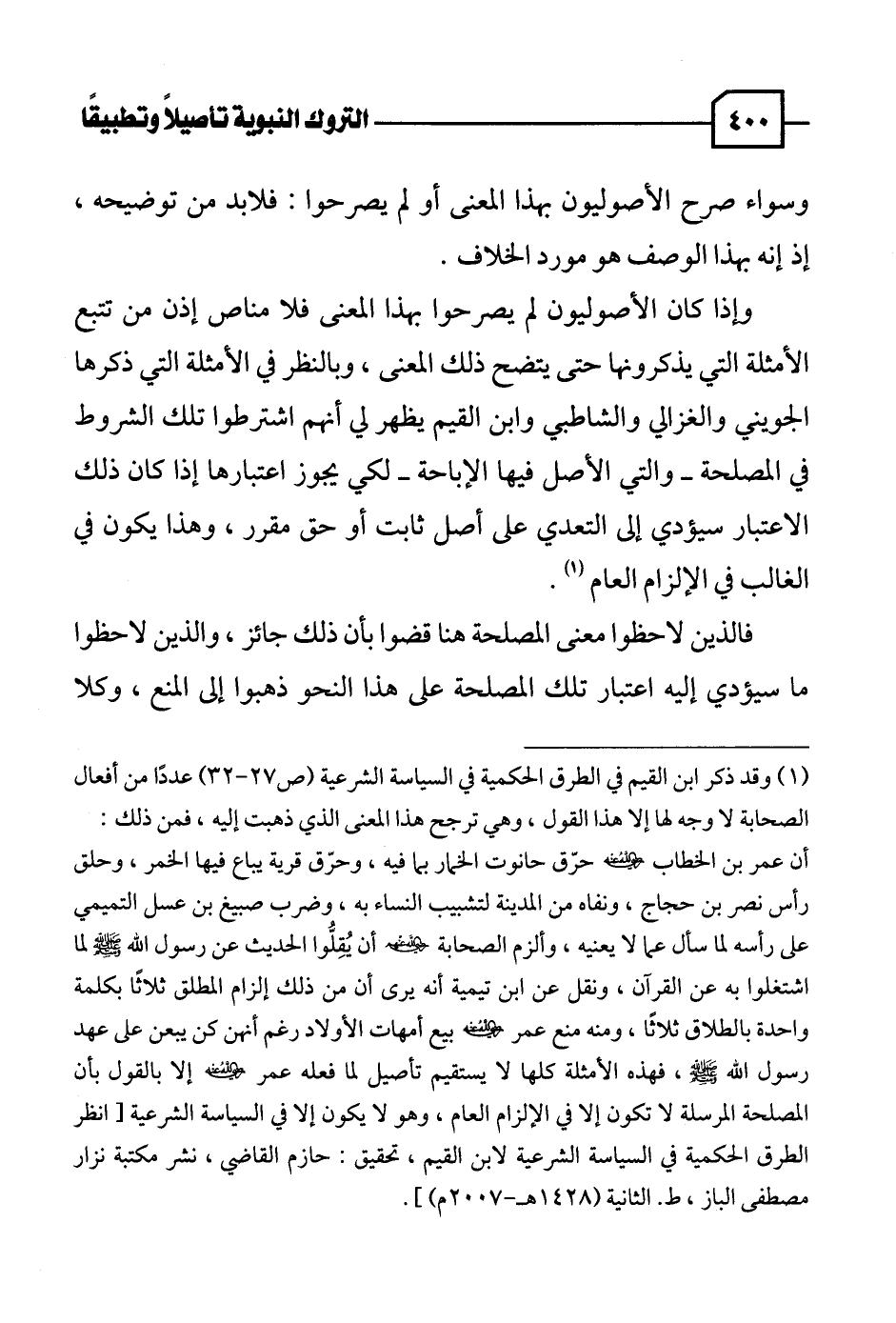 (١) وقد ذكر ابن القيم في الطرق الحكمية في السياسة الشرعية (ص ٢٧ - ٣٢) عددًا من أفعال الصحابة لا وجه لها إلا هذا القول، وهي ترجح هذا المعنى الذي ذهبت إليه، فمن ذلك: أن عمر بن الخطاب - رضي الله عنه - حرّق حانوت الخمار بما فيه، وحرّق قرية يباع فيها الخمر، وحلق رأس نصر بن حجاج، ونفاه من المدينة لتشبيب النساء به، وضرب صبيغ بن عسل التميمي على رأسه لما سأل عما لا يعنيه، وألزم الصحابة - رضي الله عنهم - أن يُقِلُّوا الحديث عن رسول الله - صلى الله عليه وسلم - لما اشتغلوا به عن القرآن، ونقل عن ابن تيمية أنه يرى أن من ذلك إلزام المطلق ثلاثًا بكلمة واحدة بالطلاق ثلاثًا، ومنه منع عمر - رضي الله عنه - بيع أمهات الأولاد رغم أنهن كن يبعن على عهد رسول الله - صلى الله عليه وسلم -، فهذه الأمثلة كلها لا يستقيم تأصيل لما فعله عمر - رضي الله عنه - إلا بالقول بأن المصلحة المرسلة لا تكون إلا في الإلزام العام، وهو لا يكون إلا في السياسة الشرعية [انظر الطرق الحكمية في السياسة الشرعية لابن القيم، تحقيق: حازم القاضي، نشر مكتبة نزار مصطفى الباز، ط. الثانية (١٤٢٨ هـ - ٢٠٠٧ م)].