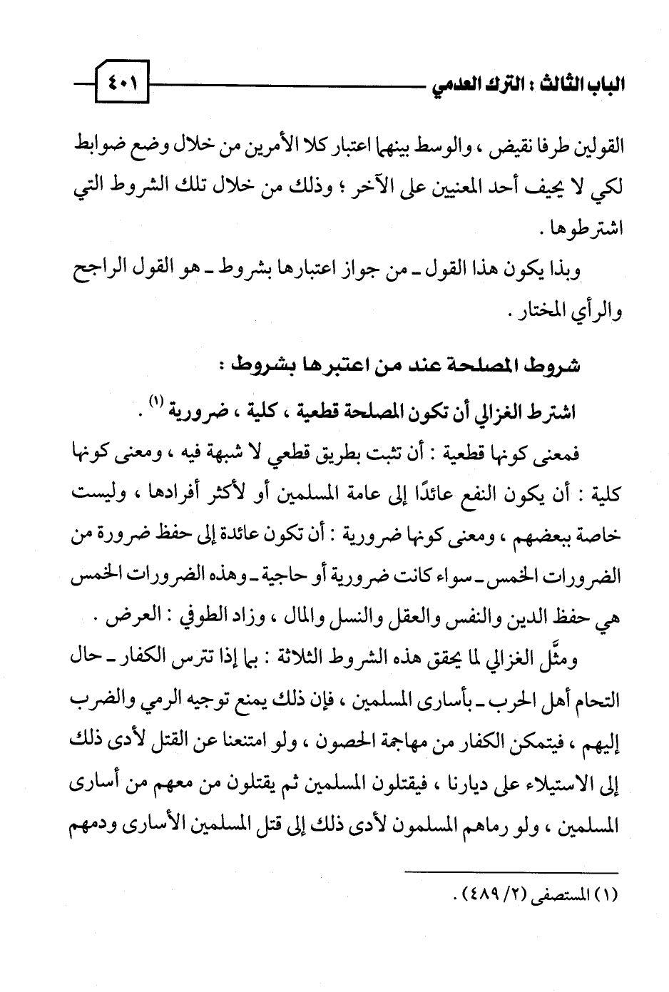 اشترط الغزالي أن تكون المصلحة قطعية، كلية، ضرورية (١).