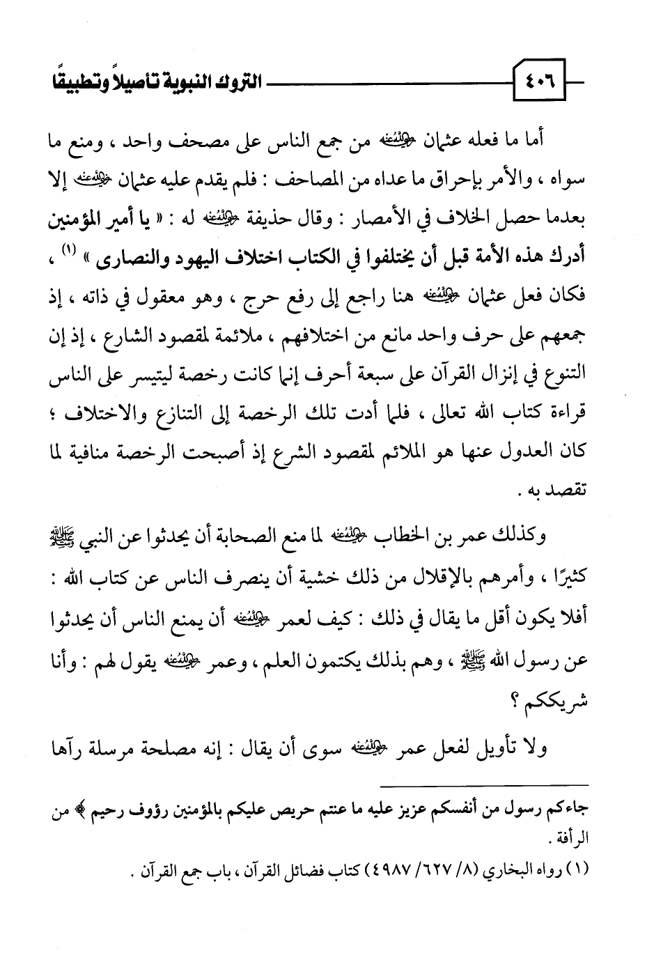 أما ما فعله عثمان - رضي الله عنه - من جمع الناس على مصحف واحد، ومنع ما سواه، والأمر بإحراق ما عداه من المصاحف: فلم يقدم عليه عثمان - رضي الله عنه - إلا بعدما حصل الخلاف في الأمصار: وقال حذيفة - رضي الله عنه - له: "يا أمير المؤمنين أدرك هذه الأمة قبل أن يختلفوا في الكتاب اختلاف اليهود والنصارى" (١)، فكان فعل عثمان - رضي الله عنه - هنا راجع إلى رفع حرج، وهو معقول في ذاته، إذ جمعهم على حرف واحد مانع من اختلافهم، ملائمة لمقصود الشارع، إذ إن التنوع في إنزال القرآن على سبعة أحرف إنما كانت رخصة ليتيسر على الناس قراءة كتاب الله تعالى، فلما أدت تلك الرخصة إلى التنازع والاختلاف، كان العدول عنها هو الملائم لمقصود الشرع إذ أصبحت الرخصة منافية لما تقصد به.
