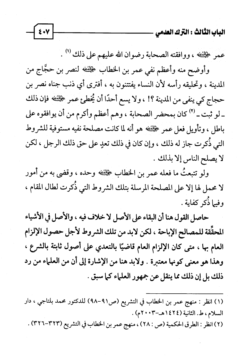 (١) انظر: منهج عمر بن الخطاب في التشريع (ص ٩١ - ٩٨) للدكتور محمد بلتاجي، دار السلام، ط. الثانية (١٤٢٤ هـ - ٢٠٠٣ م).