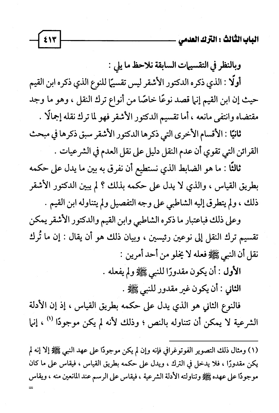 أولًا: الذي ذكره الدكتور الأشقر ليس تقسيمًا للنوع الذي ذكره ابن القيم حيث إن ابن القيم إنما قصد نوعًا خاصًا من أنواع ترك النقل، وهو ما وجد مقتضاه وانتفى مانعه، أما تقسيم الدكتور الأشقر فهو لما ترك نقله إجمالًا.
