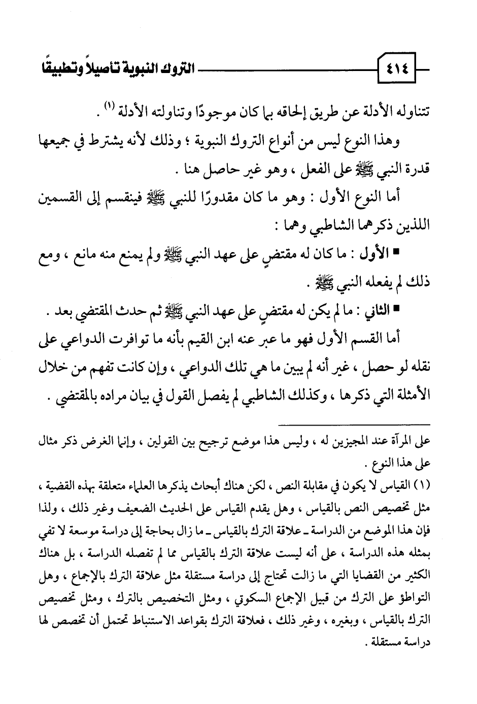 (١) القياس لا يكون في مقابلة النص، لكن هناك أبحاث يذكرها العلماء متعلقة بهذه القضية، مثل تخصيص النص بالقياس، وهل يقدم القياس على الحديث الضعيف وغير ذلك، ولذا فإن هذا الموضع من الدراسة - علاقة الترك بالقياس - ما زال بحاجة إلى دراسة موسعة لا تفي بمثله هذه الدراسة، على أنه ليست علاقة الترك بالقياس مما لم تفصله الدراسة، بل هناك الكثير من القضايا التي ما زالت تحتاج إلى دراسة مستقلة مثل علاقة الترك بالإجماع، وهل التواطؤ على الترك من قبيل الإجماع السكوتي، ومثل التخصيص بالترك، ومثل تخصيص الترك بالقياس، وبغيره، وغير ذلك، فعلاقة الترك بقواعد الاستنباط تحتمل أن تخصص لها دراسة مستقلة.