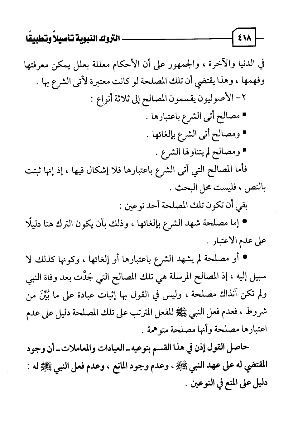 حاصل القول إذن في هذا القسم بنوعيه - العبادات والمعاملات - أن وجود المقتضي له على عهد النبي - صلى الله عليه وسلم -، وعدم وجود المانع، وعدم فعل النبي - صلى الله عليه وسلم - له: دليل على المنع في النوعين.