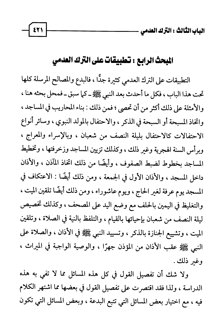 التطبيقات على الترك العدمي كثيرة جدًّا، فالبدع والمصالح المرسلة كلها تحت هذا الباب، فكل ما أحدث بعد النبي صلى الله عليه وسلم كما سبق فمحل بحثه هنا، والأمثلة على ذلك أكثر من أن تحصى، فمن ذلك: بناء المحاريب في المساجد، واتخاذ المسبحة أو السبحة في الذكر، والاحتفال بالمولد النبوي، وسائر أنواع الاحتفالات كالاحتفال بليلة النصف من شعبان، وبالإسراء والمعراج، وبرأس السنة الهجرية وغير ذلك، وكذلك تزيين المساجد وزخرفتها، وتخطيط المساجد بخطوط لضبط الصفوف، وأيضًا من ذلك اتخاذ المآذن، والأذان داخل المسجد، والأذان الأول في الجمعة، ومن ذلك أيضًا: الاعتكاف في المسجد يوم عرفة لغير الحاج، ويوم عاشوراء، ومن ذلك أيضًا تلقين الميت، والتغليظ في اليمين بالحلف مع وضع اليد على المصحف، وكذلك تخصيص ليلة النصف من شعبان بإحيائها بالقيام، والتلفظ بالنية في الصلاة، وتلقين الميت، وتشييع الجنازة بالذكر، وتسييد النبي صلى الله عليه وسلم في الأذان، والصلاة على النبي صلى الله عليه وسلم عقب الأذان من المؤذن جهرًا، والوصية الواجبة في الميراث، وغير ذلك.