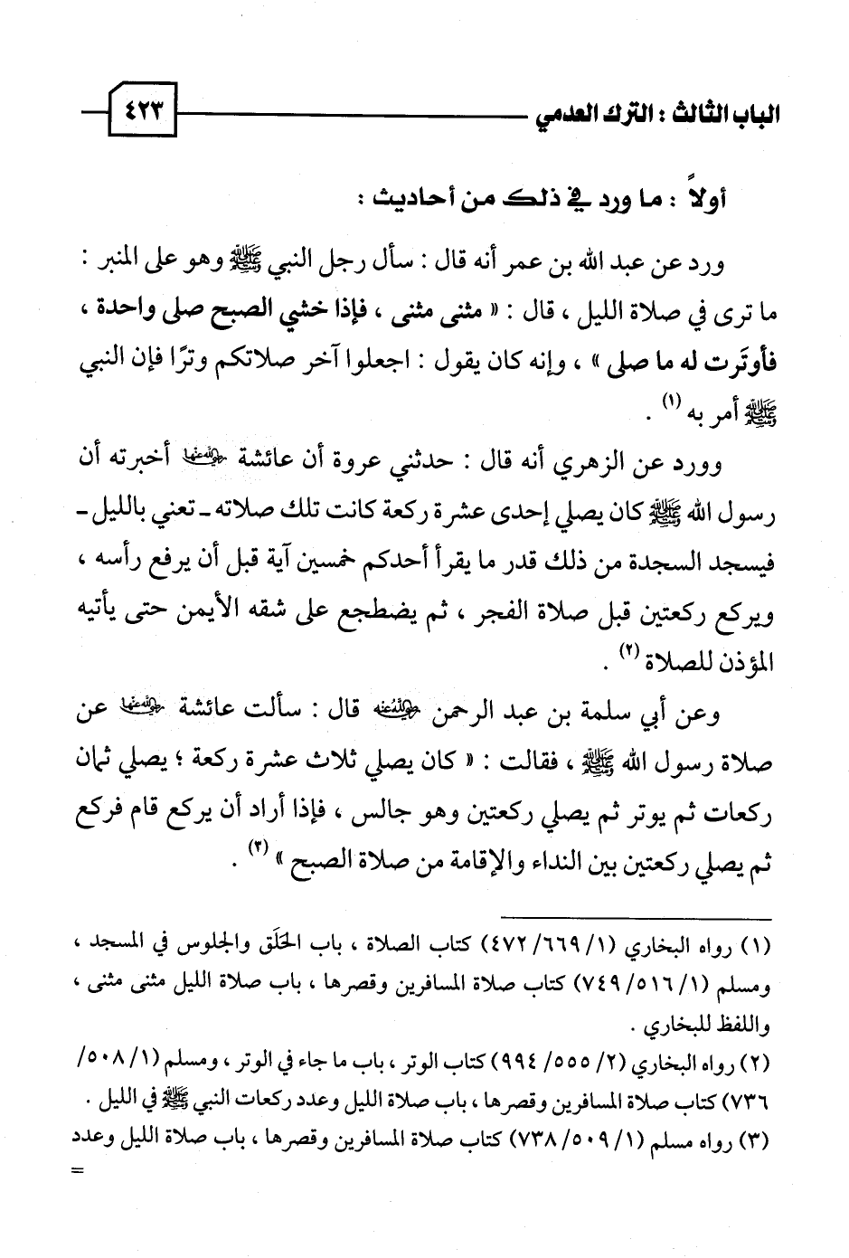 (١) رواه البخاري (١/ ٦٦٩ / ٤٧٢) كتاب الصلاة، باب الحَلَق والجلوس في المسجد، ومسلم (١/ ٥١٦ / ٧٤٩) كتاب صلاة المسافرين وقصرها، باب صلاة الليل مثنى مثنى، واللفظ للبخاري.