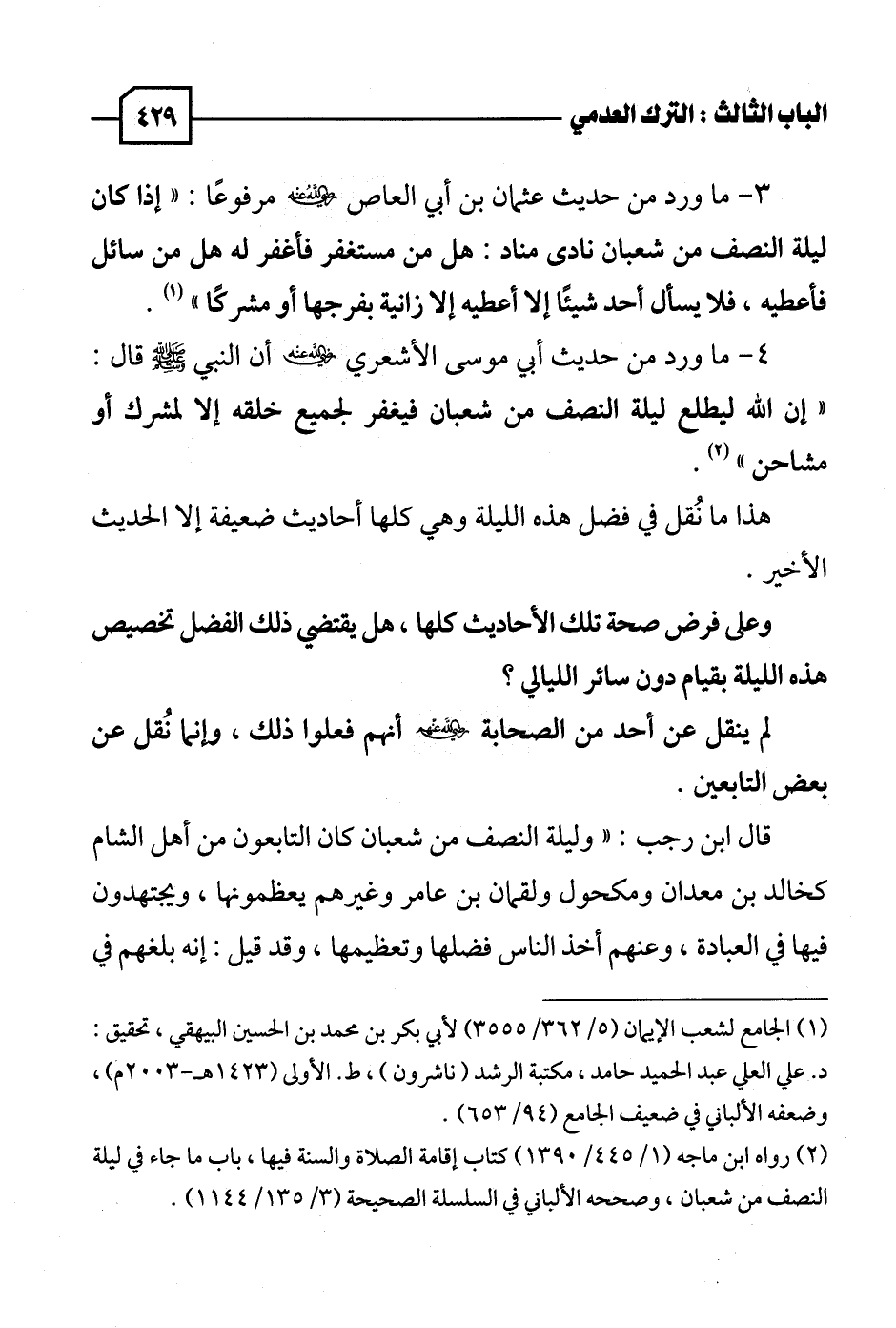 (٢) رواه ابن ماجه (١/ ٤٤٥ / ١٣٩٠) كتاب إقامة الصلاة والسنة فيها، باب ما جاء في ليلة النصف من شعبان، وصححه الألباني في السلسلة الصحيحة (٣/ ١٣٥ / ١١٤٤).