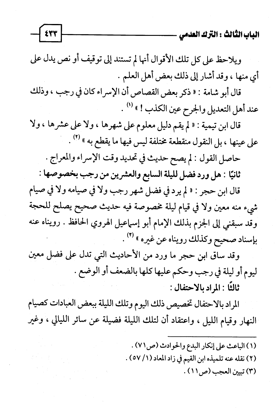 قال ابن حجر: "لم يرد في فضل شهر رجب ولا في صيامه ولا في صيام شيء منه معين ولا في قيام ليلة مخصوصة فيه حديث صحيح يصلح للحجة وقد سبقني إلى الجزم بذلك الإمام أبو إسماعيل الهروي الحافظ. رويناه عنه بإسناد صحيح وكذلك رويناه عن غيره" (٣).