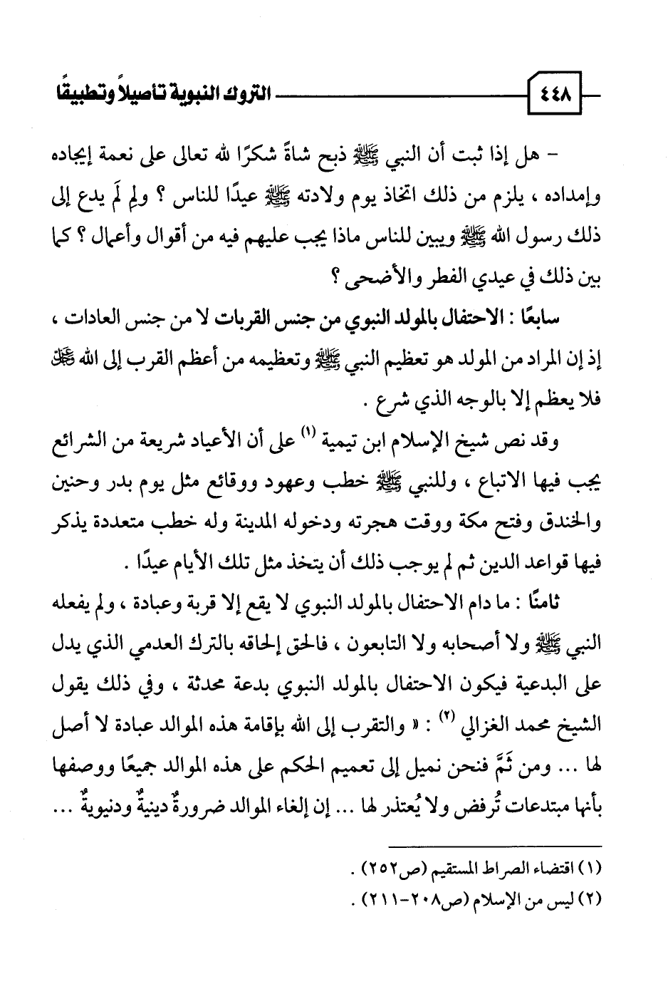 ثامنًا: ما دام الاحتفال بالمولد النبوي لا يقع إلا قربة وعبادة، ولم يفعله النبي - صلى الله عليه وسلم - ولا أصحابه ولا التابعون، فالحق إلحاقه بالترك العدمي الذي يدل على البدعية فيكون الاحتفال بالمولد النبوي بدعة محدثة، وفي ذلك يقول الشيخ محمد الغزالي (٢): "والتقرب إلى الله بإقامة هذه الموالد عبادة لا أصل لها. . . ومن ثَمَّ فنحن نميل إلى تعميم الحكم على هذه الموالد جميعًا ووصفها بأنها مبتدعات تُرفض ولا يُعتذر لها. . . إن إلغاء الموالد ضرورةٌ دينيةٌ ودنيويةٌ. . .
