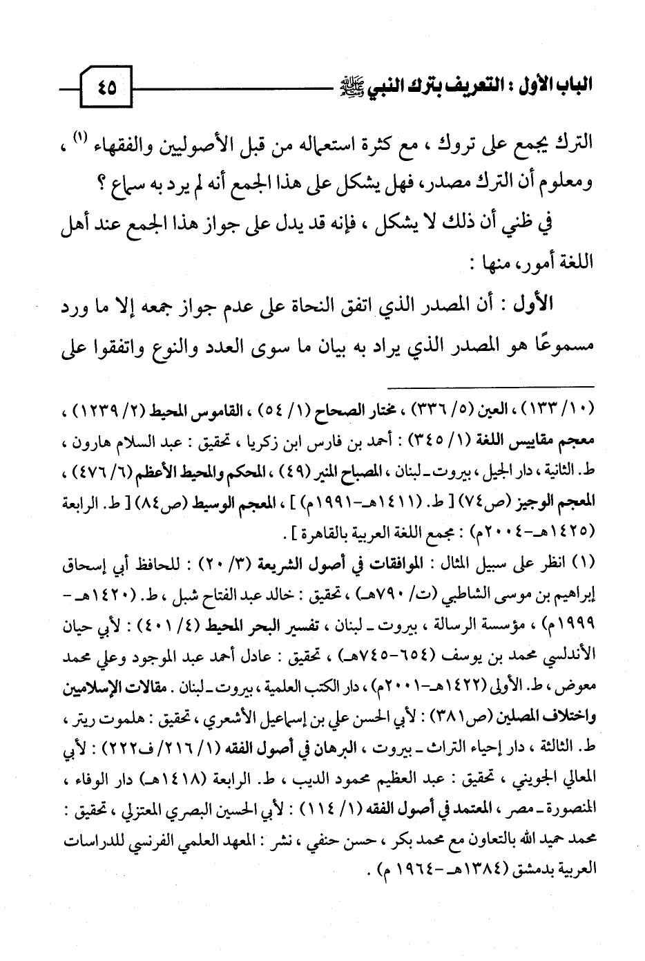 (١) انظر على سبيل المثال: الموافقات في أصول الشريعة (٣/ ٢٠): للحافظ أبي إسحاق إبراهيم بن موسى الشاطبي (ت/ ٧٩٠ هـ)، تحقيق: خالد عبد الفتاح شبل، ط. (١٤٢٠ هـ - ١٩٩٩ م)، مؤسسة الرسالة، بيروت - لبنان، تفسير البحر المحيط (٤/ ٤٠١): لأبي حيان الأندلسي محمد بن يوسف (٦٥٤ - ٧٤٥ هـ)، تحقيق: عادل أحمد عبد الموجود وعلي محمد معوض، ط. الأولى (١٤٢٢ هـ - ٢٠٠١ م)، دار الكتب العلمية، بيروت - لبنان. مقالات الإسلاميين واختلاف المصلين (ص ٣٨١): لأبي الحسن علي بن إسماعيل الأشعري، تحقيق: هلموت ريتر، ط. الثالثة، دار إحياء التراث - بيروت، البرهان في أصول الفقه (١/ ٢١٦ / ف ٢٢٢): لأبي المعالي الجويني، تحقيق: عبد العظيم محمود الديب، ط. الرابعة (١٤١٨ هـ) دار الوفاء، المنصورة - مصر، المعتمد في أصول الفقه (١/ ١١٤): لأبي الحسين البصري المعتزلي، تحقيق: محمد حميد الله بالتعاون مع محمد بكر، حسن حنفي، نشر: المعهد العلمي الفرنسي للدراسات العربية بدمشق (١٣٨٤ هـ - ١٩٦٤ م).