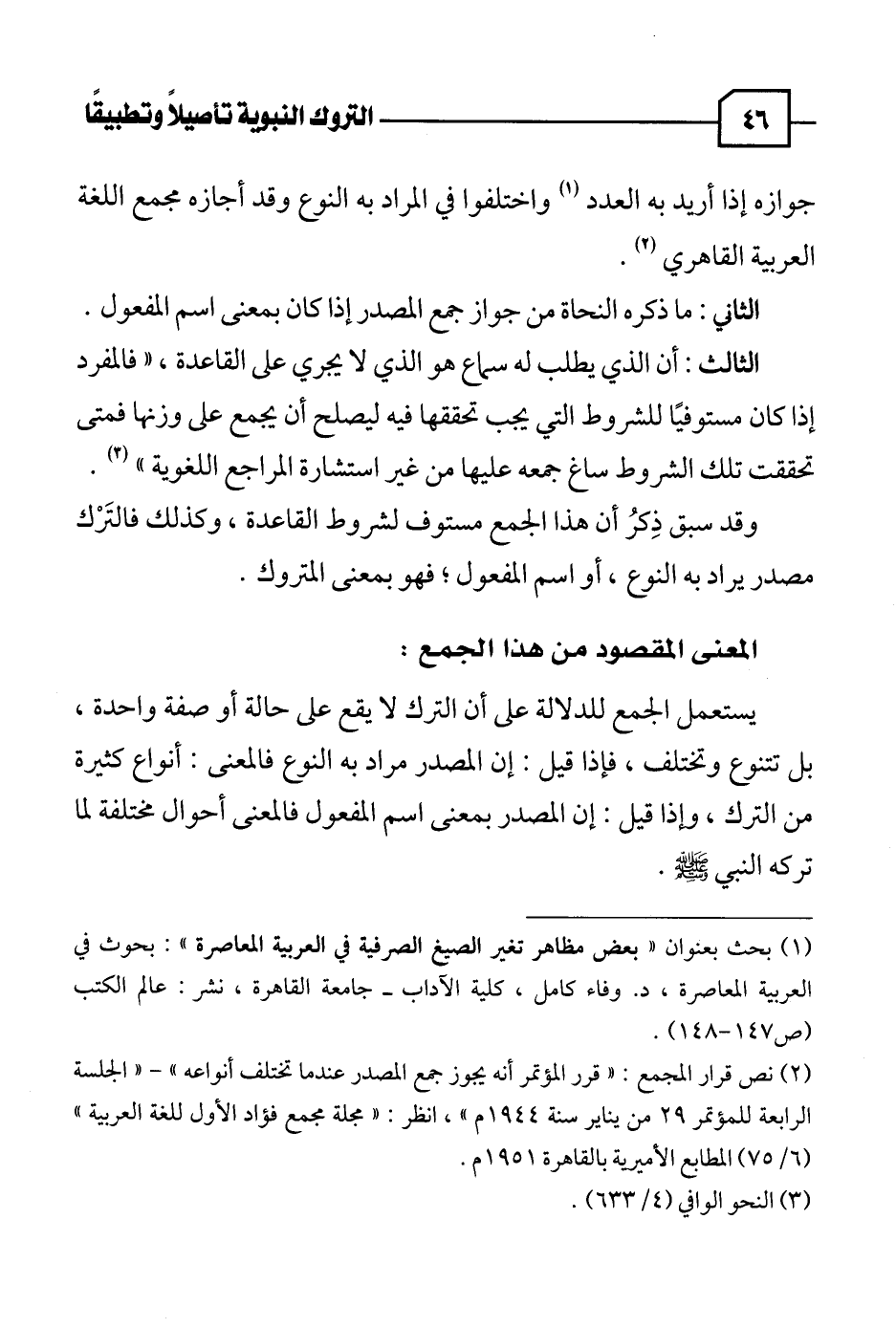 (٢) نص قرار المجمع: "قرر المؤتمر أنه يجوز جمع المصدر عندما تختلف أنواعه" - "الجلسة الرابعة للمؤتمر ٢٩ من يناير سنة ١٩٤٤ م"، انظر: "مجلة مجمع فؤاد الأول للغة العربية" (٦/ ٧٥) المطابع الأميرية بالقاهرة ١٩٥١ م.