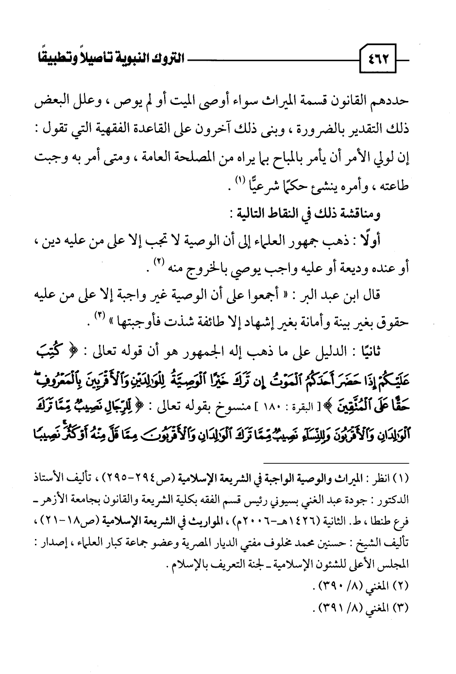 ثانيًا: الدليل على ما ذهب إليه الجمهور هو أن قوله تعالى: {كُتِبَ عَلَيْكُمْ إِذَا حَضَرَ أَحَدَكُمُ الْمَوْتُ إِنْ تَرَكَ خَيْرًا الْوَصِيَّةُ لِلْوَالِدَيْنِ وَالْأَقْرَبِينَ بِالْمَعْرُوفِ حَقًّا عَلَى الْمُتَّقِينَ (١٨٠)} [البقرة: ١٨٠]، منسوخ بقوله تعالى: {لِلرِّجَالِ نَصِيبٌ مِمَّا تَرَكَ الْوَالِدَانِ وَالْأَقْرَبُونَ وَلِلنِّسَاءِ نَصِيبٌ مِمَّا تَرَكَ الْوَالِدَانِ وَالْأَقْرَبُونَ مِمَّا قَلَّ مِنْهُ أَوْ كَثُرَ نَصِيبًا