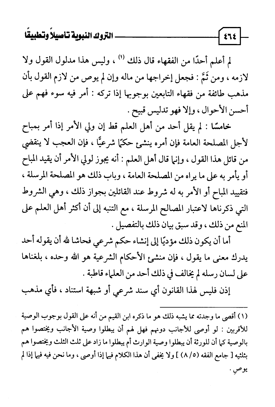 خامسًا: لم يقل أحد من أهل العلم قط إن ولي الأمر إذا أمر بمباح لأجل المصلحة العامة فإن أمره ينشئ حكمًا شرعيًّا، فإن العجب لا ينقضي من قائل هذا القول، وإنما قال أهل العلم: أنه يجوز لولي الأمر أن يقيد المباح أو يأمر به على ما يراه من المصلحة العامة، وباب ذلك هو المصلحة المرسلة، فتقييد المباح أو الأمر به له شروط عند القائلين بجواز ذلك، وهي الشروط التي ذكرناها لاعتبار المصالح المرسلة، مع التنبه إلى أن أكثر أهل العلم على المنع من ذلك، وقد سبق بيان ذلك بالتفصيل.