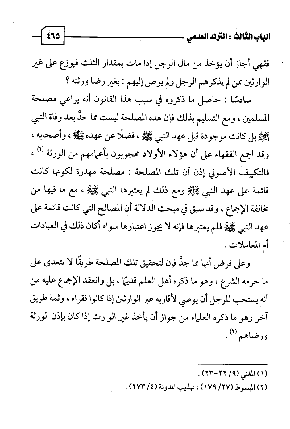 سادسًا: حاصل ما ذكروه في سبب هذا القانون أنه يراعي مصلحة المسلمين، ومع التسليم بذلك فإن هذه الصلحة ليست مما جدَّ بعد وفاة النبي - صلى الله عليه وسلم - بل كانت موجودة قبل عهد النبي - صلى الله عليه وسلم -، فضلًا عن عهده - صلى الله عليه وسلم -، وأصحابه، وقد أجمع الفقهاء على أن هؤلاء الأولاد محجوبون بأعمامهم من الورثة (١)، فالتكييف الأصولي إذن أن تلك المصلحة: مصلحة مهدرة لكونها كانت قائمة على عهد النبي - صلى الله عليه وسلم - ومع ذلك لم يعتبرها النبي - صلى الله عليه وسلم -، مع ما فيها من مخالفة الإجماع، وقد سبق في مبحث الدلالة أن المصالح التي كانت قائمة على عهد النبي - صلى الله عليه وسلم - فلم يعتبرها فإنه لا يجوز اعتبارها سواء أكان ذلك في العبادات أم المعاملات.