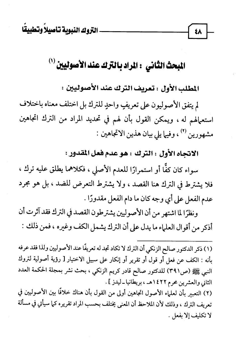 (١) ذكر الدكتور صالح الزنكي أن الترك لا تكاد تجد له تعريفًا عند الأصوليين ولذا فقد عرفه بأنه: الكف عن فعل أو قول أو تقرير أو إنكار على سبيل الاختيار [رؤية أصولية لتروك النبي - صلى الله عليه وسلم - (ص ٣٩١) للدكتور صالح قادر كريم الزنكي، بحث نشر بمجلة الحكمة العدد الثاني والعشرين محرم ١٤٢٢ هـ، بريطانيا - ليدز].
