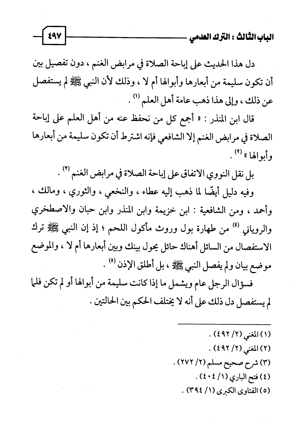 قال ابن المنذر: "أجمع كل من نحفظ عنه من أهل العلم على إباحة الصلاة في مرابض الغنم إلا الشافعي فإنه اشترط أن تكون سليمة من أبعارها وأبوالها" (٢).