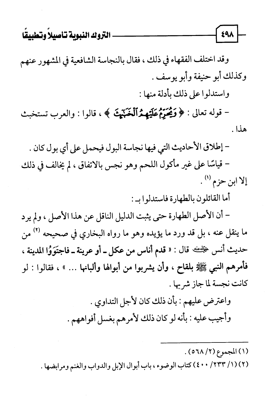 - أن الأصل الطهارة حتى يثبت الدليل الناقل عن هذا الأصل، ولم يرد ما ينقل عنه، بل قد ورد ما يؤيده وهو ما رواه البخاري في صحيحه (٢) من حديث أنس - رضي الله عنه - قال: "قدم أناس من عكل - أو عرينة - فاجتَوَوُا المدينة، فأمرهم النبي - صلى الله عليه وسلم - بلقاح، وأن يشربوا من أبوالها وألبانها. . ."، فقالوا: لو كانت نجسة لما جاز شربها.