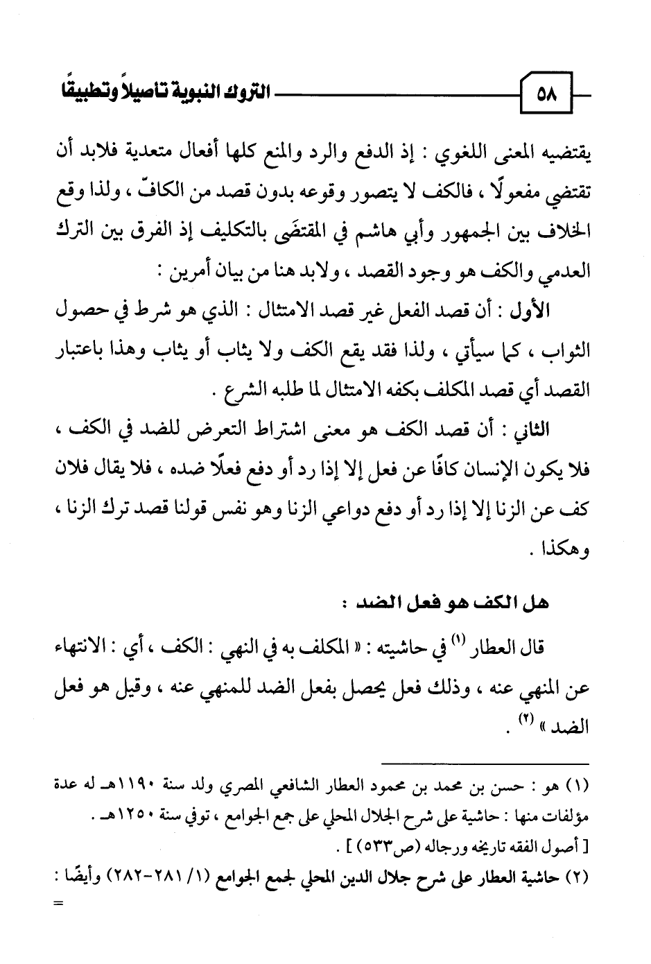 الثاني: أن قصد الكف هو معنى اشتراط التعرض للضد في الكف، فلا يكون الإنسان كافًا عن فعل إلا إذا رد أو دفع فعلاً ضده، فلا يقال فلان كف عن الزنا إلا إذا رد أو دفع دواعي الزنا وهو نفس قولنا قصد ترك الزنا، وهكذا.