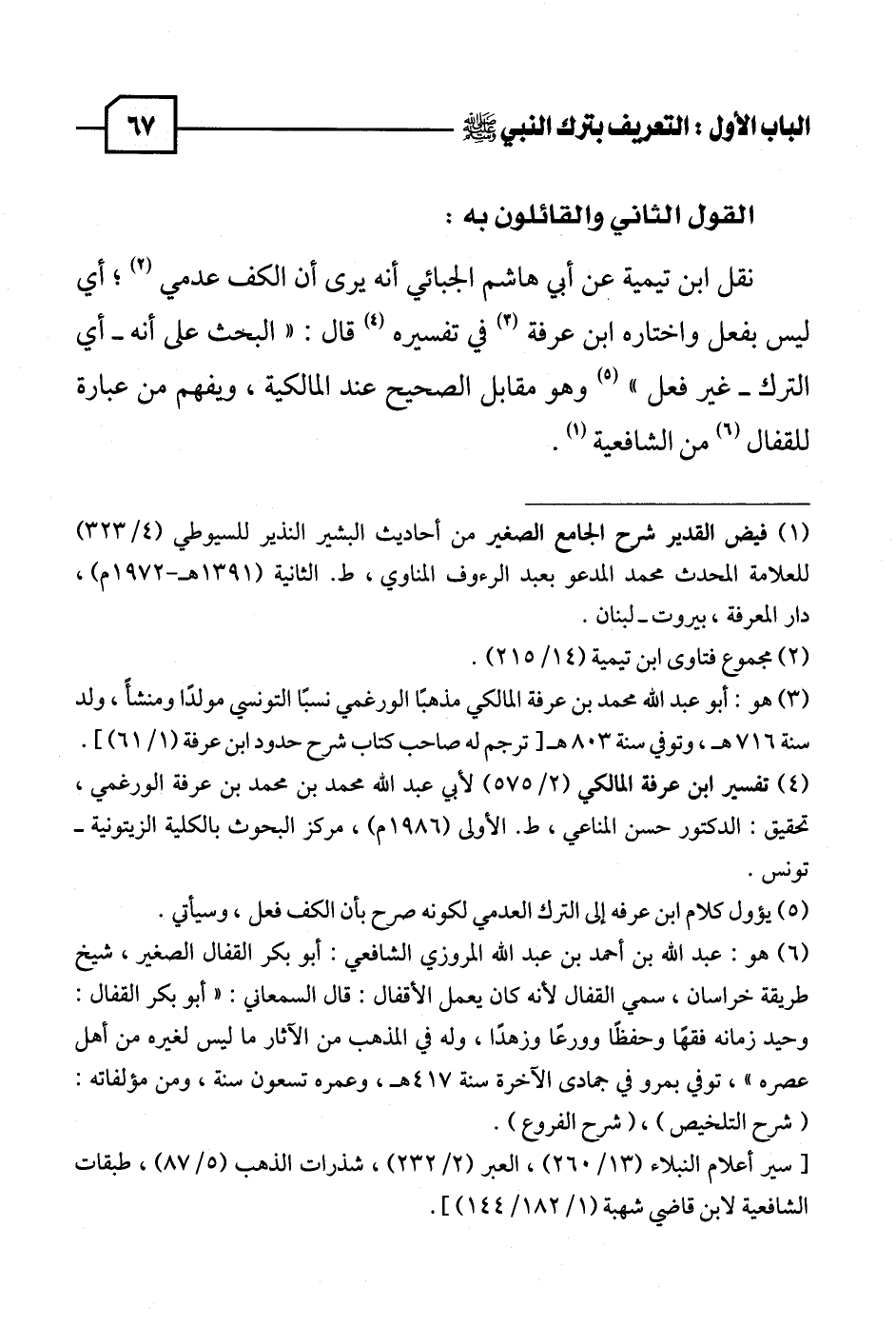 نقل ابن تيمية عن أبي هاشم الجبائي أنه يرى أن الكف عدمي (٢)؛ أي ليس بفعل واختاره ابن عرفة (٣) في تفسيره (٤) قال: "البحث على أنه - أي الترك - غير فعل" (٥) وهو مقابل الصحيح عند المالكية، ويفهم من عبارة للقفال (٦)