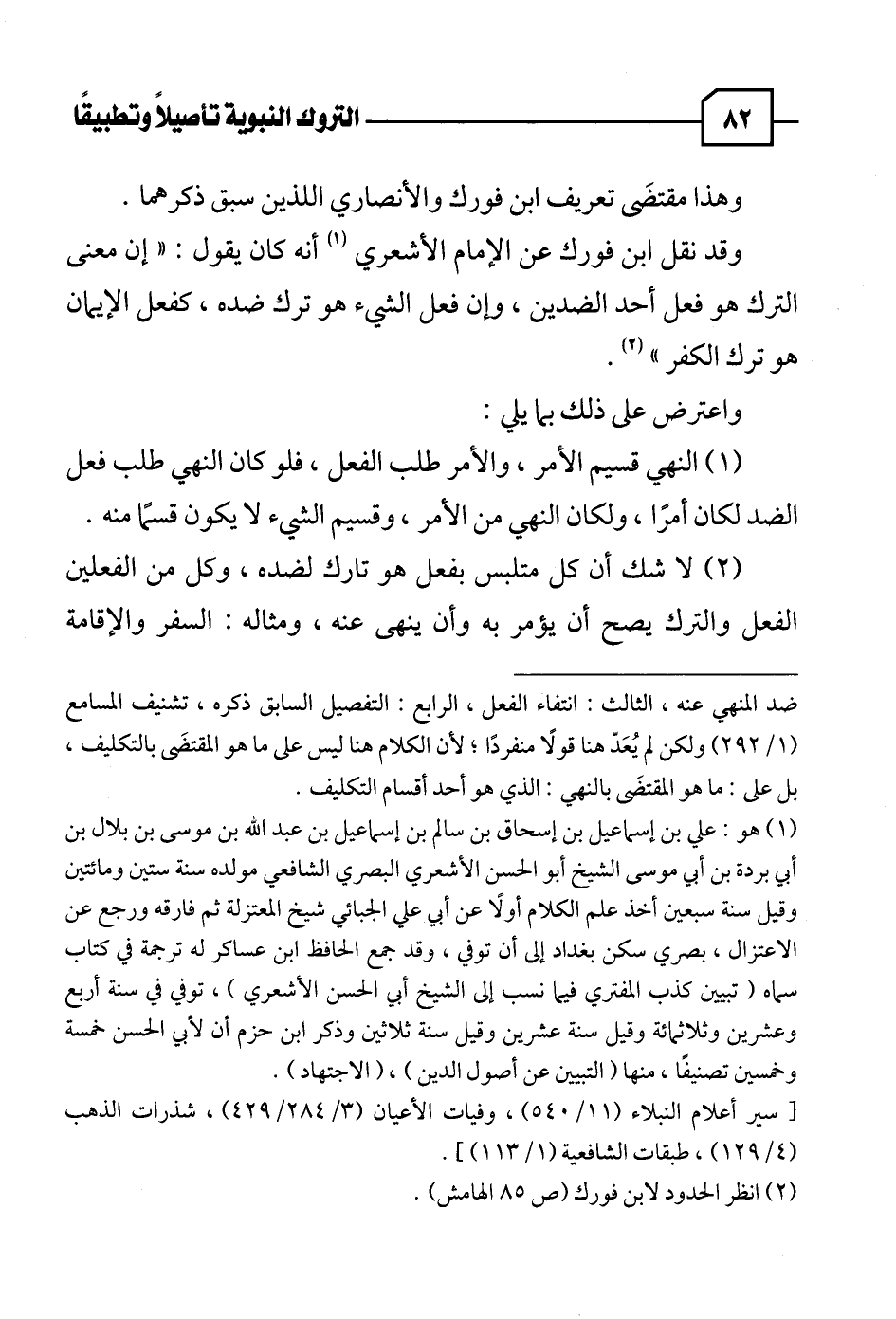وقد نقل ابن فورك عن الإمام الأشعري (١) أنه كان يقول: "إن معنى الترك هو فعل أحد الضدين، وإن فعل الشيء هو ترك ضده، كفعل الإيمان هو ترك الكفر" (٢).