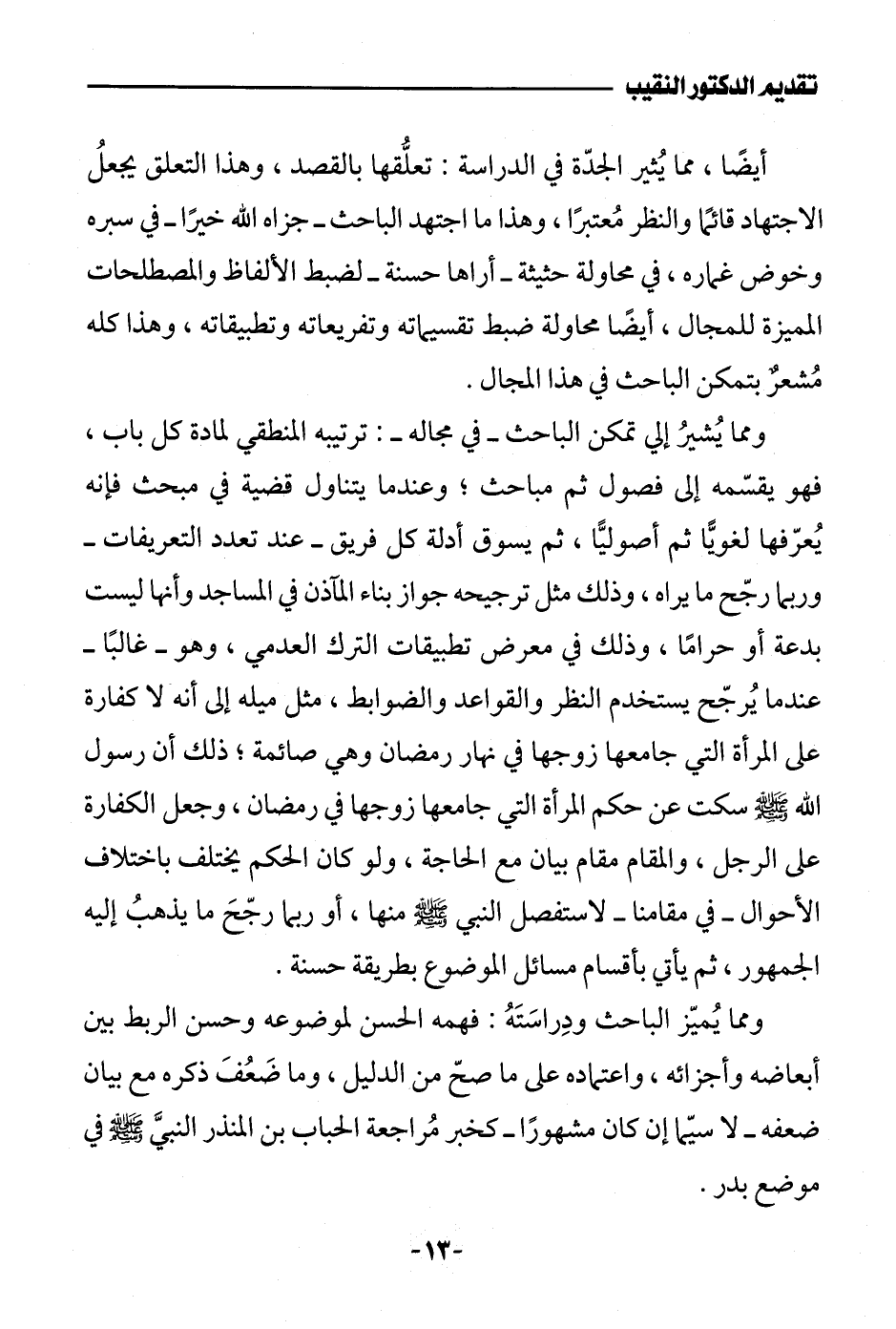 ومما يُميّز الباحث ودِراسَتَهُ: فهمه الحسن لموضوعه وحسن الربط بين أبعاضه وأجزائه، واعتماده على ما صحّ من الدليل، وما ضَعُفَ ذكره مع بيان ضعفه - لا سيّما إن كان مشهورًا - كخبر مُراجعة الحباب بن المنذر النبيَّ - صلى الله عليه وسلم - موضع بدر.