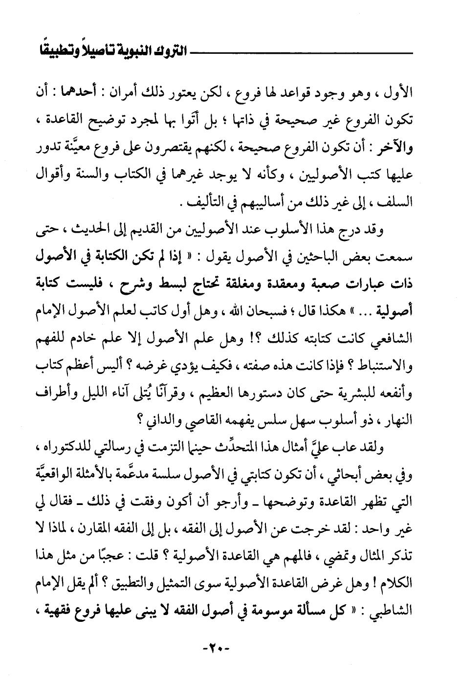 ولقد عاب عليَّ أمثال هذا المتحدِّث حينما التزمت في رسالتي للدكتوراه، وفي بعض أبحاثي، أن تكون كتابتي في الأصول سلسة مدعَّمة بالأمثلة الواقعيَّة التي تظهر القاعدة وتوضحها - وأرجو أن أكون وفقت في ذلك - فقال لي غير واحد: لقد خرجت عن الأصول إلى الفقه، بل إلى الفقه المقارن، لماذا لا تذكر المثال وتمضي، فالمهم هي القاعدة الأصولية؟ قلت: عجبًا من مثل هذا الكلام! وهل غرض القاعدة الأصولية سوى التمثيل والتطبيق؟ ألم يقل الإمام الشاطبي: "كل مسألة موسومة في أصول الفقه لا يبنى عليها فروع فقهية،