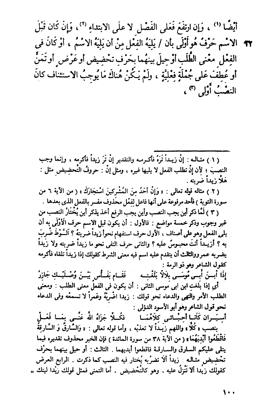 أيضا، وإن ارتفع فعلى الفصل لا على الابتداء، وإن كان قبل الاسم حرف هو أولى بأن يليه الفعل من أن يليه الاسم، أو كان في الفعل معنى الطلب أو حيل بينهما بحرف تحضيض أو عرف أو تمن أو عطف على جملة فعلية، ولم يكن هناك ما يوجب الاستئناف كان النصب أولى،