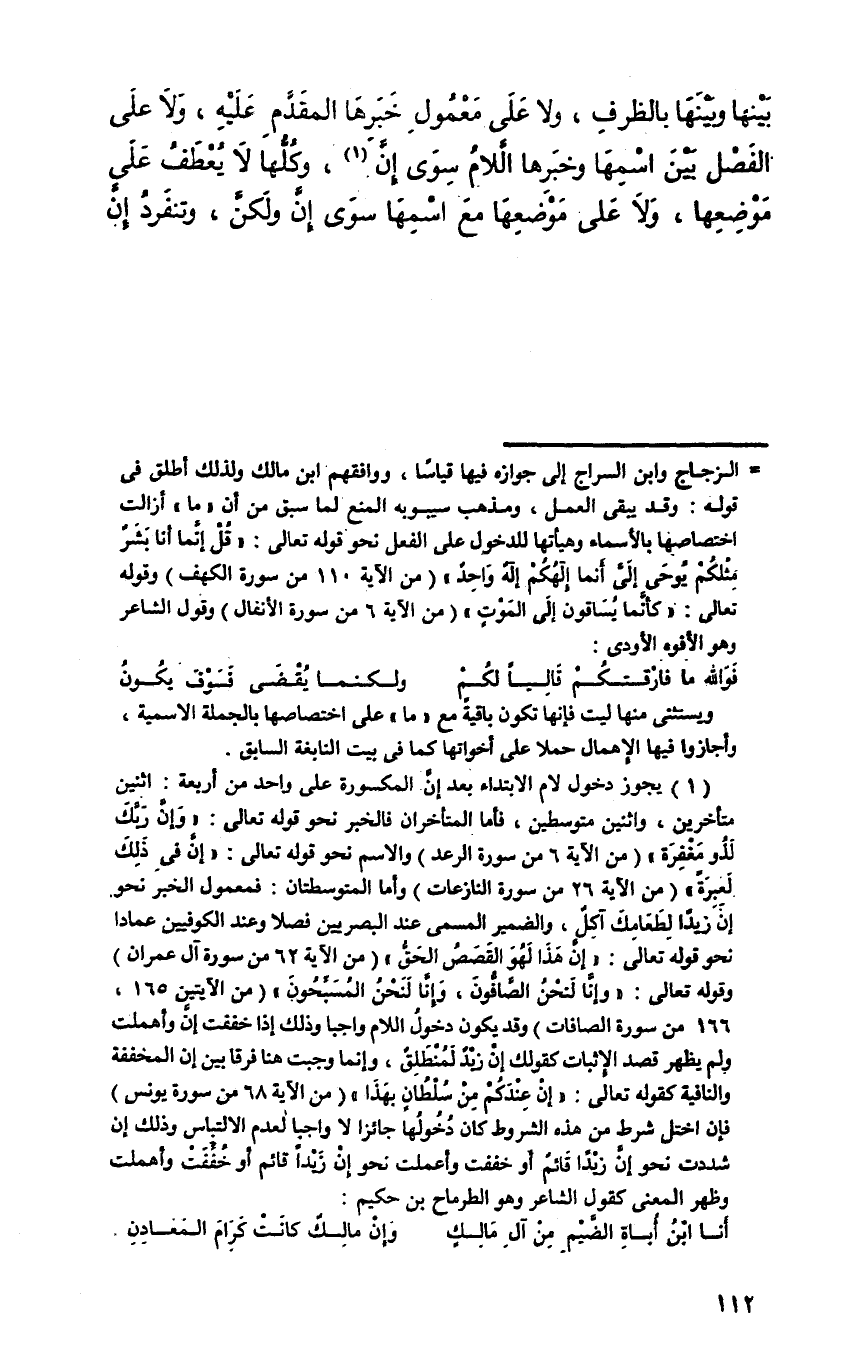 بينها وبينها بالظرف، ولا على معمول خبرها المقدم عليه، ولا على الفصل بين اسمها وخبرها اللام سوى إنَّ، وكلها لا يعطف على موضعها، ولا على موضعها مع اسمها سوى إنَّ ولكن، وتنفرد إن