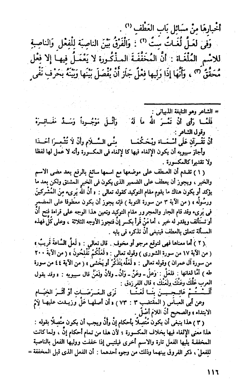 وفي لعل لغات ست: والفرق بين الناصبة للفعل والناصبة للاسم الملغاة: أن المخففة المذكورة لا يعمل فيها إلا فعل محقق، وأنها إذا وليها فعل جاز أن يفصل بينها وبينه بحرف نفي