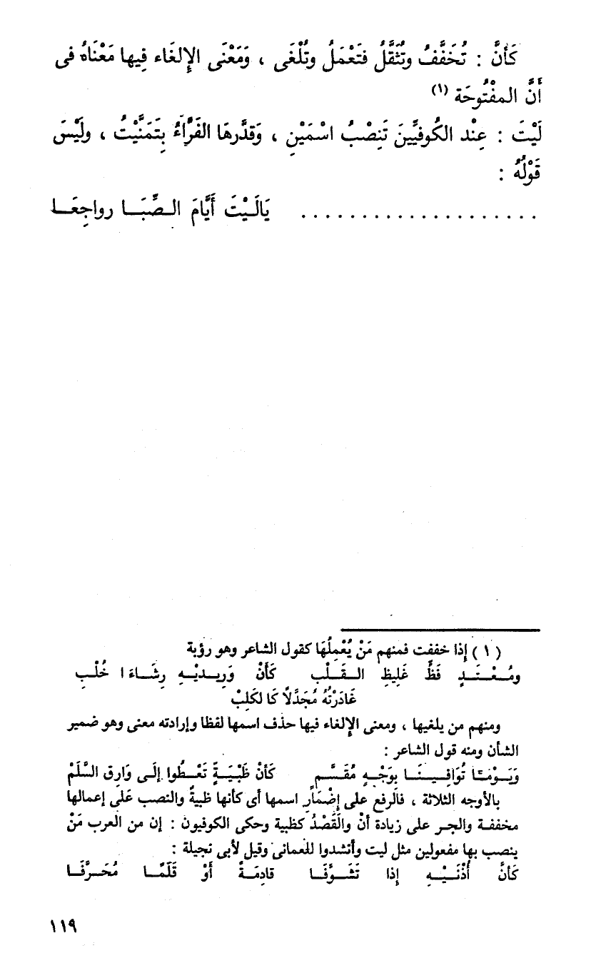 ليت: عند الكوفيين تنصب اسمين، وقدرها الفراء بتمنيت، وليس قوله: