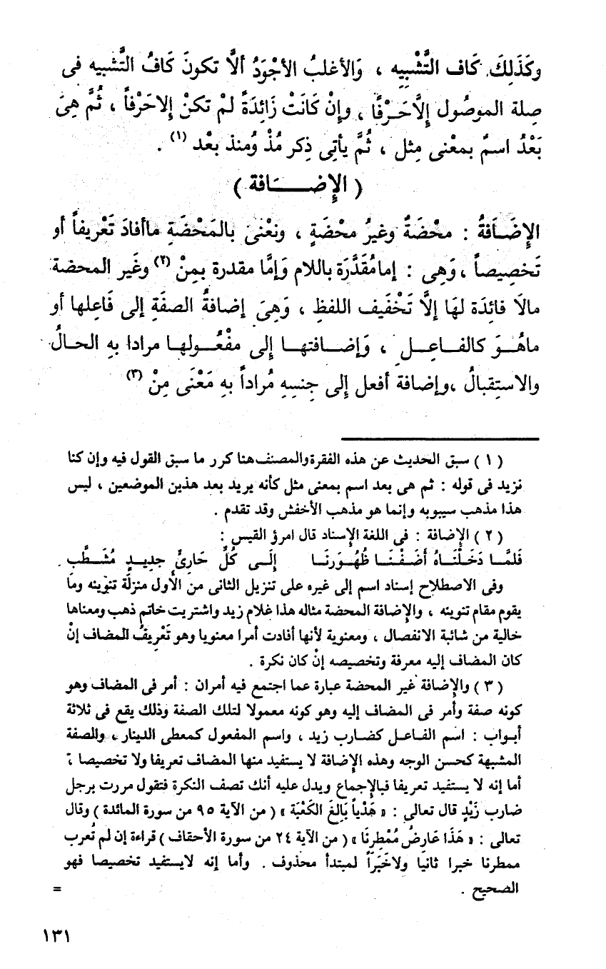 الإضافة: محضة وغير محضة، ونعني بالمحضة ما أفاد تعريفا أو تخصيصا، وهي إما مقدرة باللام وإما مقدرة بمن وغير المحضة ما لا فائدة لها إلا تخفيف اللفظ، وهي إضافة الصفة إلى فاعلها أو ما هو كالفاعل، وإضافتها إلى مفعولها مرادا به الحال والاستقبال، وإضافة أفعل إلى جنسه مرادا به معنى من.
