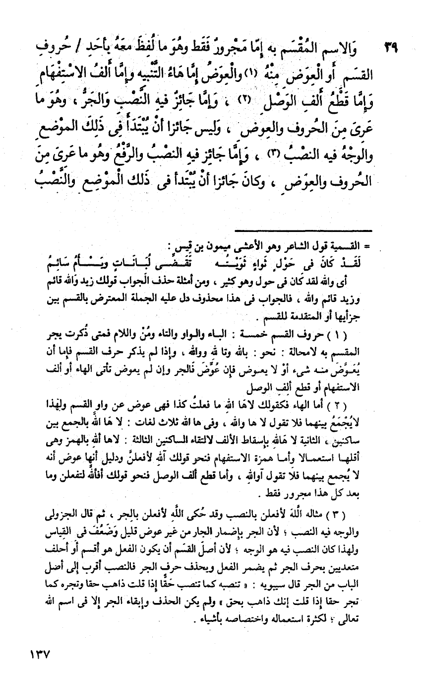 والاسم المقسم به إما مجرور فقط وهو ما لفظ معه بأحد حروف القسم أو العوض منه والعوض إما هاء التنبيه وإما ألف الاستفهام وإما قطع ألف الوصل، وإما جائز فيه النصب والجر، وهو ما عري من الحروف والعوض، وليس جائزا أن يبتدأ في ذلك الموضع، والوجه فيه النصب، وإما جائز فيه النصب والرفع وهو ما عري من الحروف والعوض، وكان جائزا أن يبتدأ في ذلك الموضع والنصب