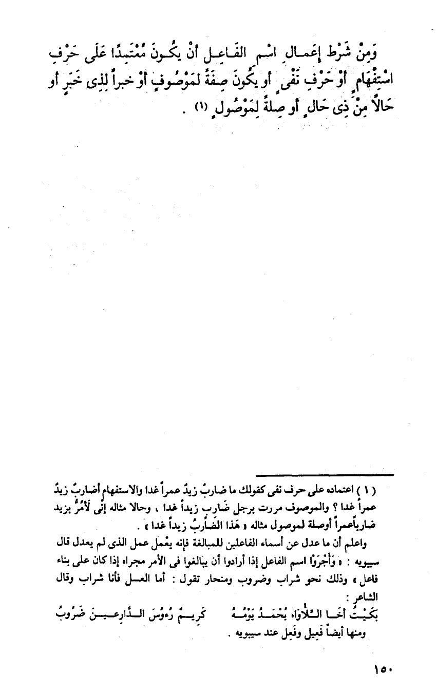 ومن شرط إعمال اسم الفاعل أن يكون معتمدا على حرف استفهام أو حرف نفي أو يكون صفة لموصوف أو خبرا لذي خبر أو حالا من ذي حال أو صلة لموصول.