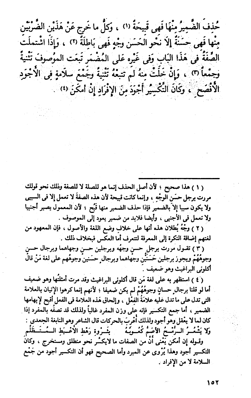 حذف الضمير منها فهي قبيحة، وكل ما خرج عن هذين الضربين منها فهي حسنة إلا نحو الحسن وجهٍ فهي باطلة، وإذا اشتملت الصفة في هذا الباب وفي غيره على المضمر تبعت الموصوف تثنية وجمعا، وإن خلت منه لم تتبعه تثنية وجمعَ سلامةٍ في الأجود الأفصح، وكان التكسير أجود من الإفراد إن أمكن.