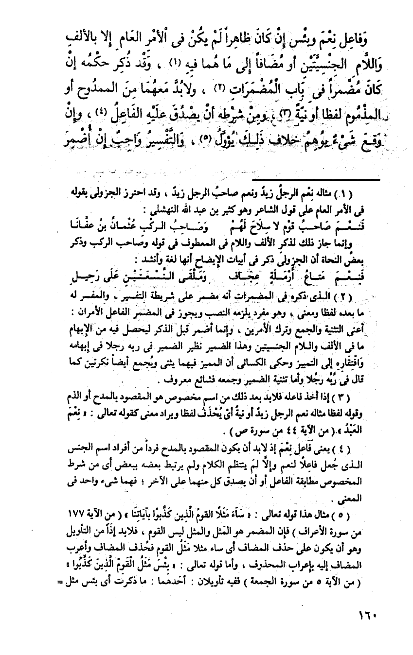 وفاعل نعم وبئس إن كان ظاهرا لم يكن في الأمر العام إلا بالألف واللام الجنسيتين أو مضافا إلى ما هما فيه، وقد ذكر حكمه إن كان مضمرا في باب المضمرات، ولا بد معهما من الممدوح أو المذموم لفظا أو نية، ومن شرطه أن يصدق عليه الفاعل، وإن وقع شيء يوهم خلاف ذلك يؤول، والتفسير واجب إن أضمر